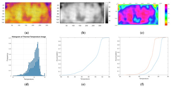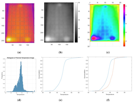 Figure 13a shows the original IR image of the first panel with a clear and bright area in the top middle that corresponds to a defected cell while the upper middle is the junction box as mentioned before. The dark purple lines around the cells are frames of the panel. Figure 13b shows an image converted to grayscale after Gaussian filtering but the bright region still appears clearly. Figure 13c shows a 3-D color image after Gaussian filtering to tell the temperature difference that the hot spot in the top middle is at about 53 °C. Panel frames are at the temperature of 43 °C while the rest of the panel is at around 45~49 °C. Figure 13d shows a histogram of the temperature distribution. The PDF curve still looks like a beta distribution function. The mean temperature is 42 °C with the deviation of −11 °C. The maximum temperature is 53 °C and the minimum temperature is 30 °C. Figure 13e displays the cumulative temperature distribution that the percentage of hot spot area over 50 °C is 1.6%, indicating there is only one cell exceeding the temperature threshold. Finally, Figure 5e and Figure 13e are superimposed in Figure 13f for comparing normal and abnormal conditions. It is found that the area over 50 °C is about 1.6%, which is close to the 1.5% threshold presumed for a normal solar module, indicating that there is no abnormality or failure. The above description shows that 98.5% of the panel is within the normal area, as shown in Figure 13d,e. This is consistent with Figure 13a–c, which shows that bright area of hot spot is clearly visible.