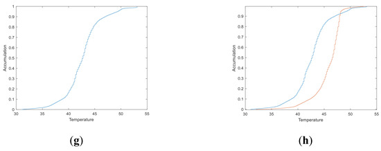 The second panel at the same location has a wide bright area in the upper part as shown in Figure 14a,b and it is a visible light image, not an IR image. This bright area is caused by the direct reflection of sunlight. Figure 14d shows the IR image of the same panel taken at the same time as the visual light image. The wide bright area of reflection disappears but a clear and bright zone with a smaller area still exists in the right middle that corresponds to defected cells. Figure 14e shows an image converted to grayscale after Gaussian filtering and the bright zone still appears clearly. Figure 14f shows a histogram of the temperature distribution. The PDF curve still looks like a beta distribution function and the huge bump with 41 °C is caused by panel frames. The mean temperature is 43 °C with the deviation of −10 °C. The maximum temperature is 53 °C and the minimum temperature is 30 °C. Figure 14g displays the cumulative temperature distribution that the percentage of hot spot area over 50 °C is 3%, indicating there is one cell with high temperature. Finally, Figure 5e and Figure 14g are superimposed in Figure 14h for comparing normal and abnormal conditions. Figure 14g shows that the area over 50 °C is about 3%, which is 1.5% higher than threshold presumed for a normal solar module, indicating that there is one cell abnormality or failure. The above description shows that 97% of the panel is within the normal area, as shown in Figure 14f,g.