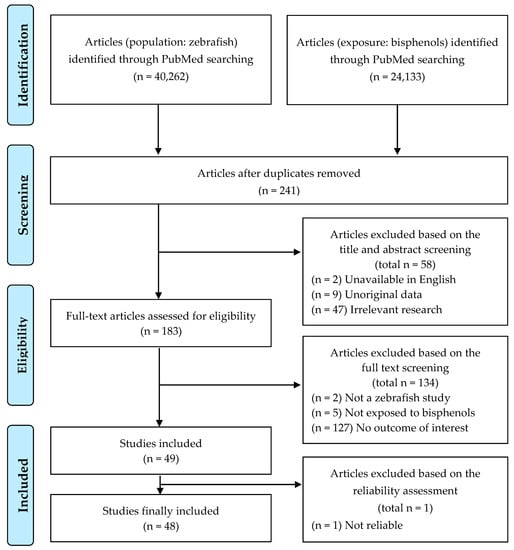 Study selection is summarized in a flow chart (Figure 1). Literature searches in PubMed identified 40,262 studies related to zebrafish and 24,133 studies related to bisphenols. After removing duplicate records, 241 articles were identified as relevant. After title and abstract screening, 58 articles were excluded based on the following criteria: (a) unavailability in English, (b) unoriginal data, and (c) irrelevant research. Of these 183 publications, 49 were included in this review based on full text screening.