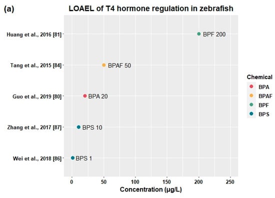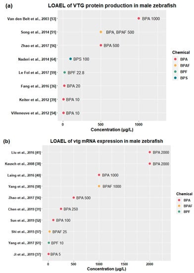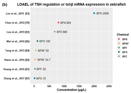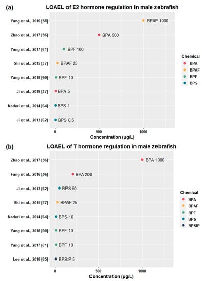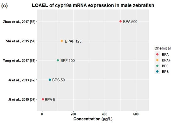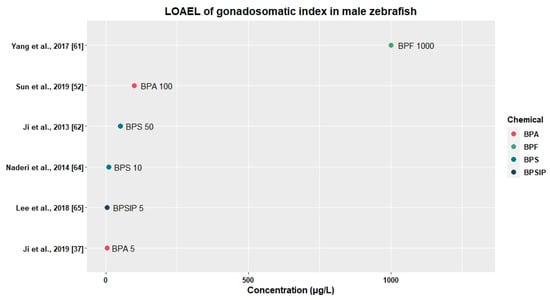 It has been reported that functions of the reproductive system are susceptible to disruption by endocrine-disrupting chemicals. Thirty-eight studies showed that BPA [,,,,,,,,,,,,,,,,,,,,,,,,,,,,], BPAF [,,,,], BPC [], BPF [,,,,,,,,,,,,,,,], BPS [,,,,,,], and BPSIP [] disturbed fecundity, fertility, relative organ weight, vitellogenin protein production, sex hormone production, and mRNA expression related to the HPG axis (Table 3).