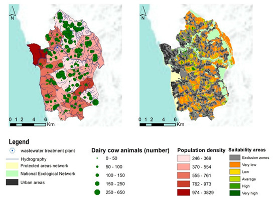| Wastewater Treatment units (ETARS) distance | Distance (m), Reclassify; Overlay; network analysis (land use planning; economic costs) | (0–250 m- 5; 250–500 m- 4; 500–750 m- 3; 750–1000 m- 2; 1000–1250 m- 1; >1250 m- 1) | Águas de Portugal | 26.70 | |