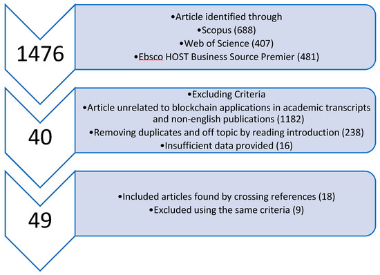 The initial sample was composed of 1476 papers, of which 688 were extracted from Scopus, 307 from Web of Science and 481 from EBSCO Host. A first screening of title and abstracts reduced the sample to 120, 98, and 76, respectively. The first step aimed to remove off-topic articles, whilst a second screening was undertaken to withdraw papers that did not focus on specific blockchain applications in education. The second screening led to 56 entries after reading the introductory part and removing duplicates from each database. The sample was then reduced to 40 articles after a full-text reading, excluding those that could not provide all the data for extraction. Crossing the final sample’s reference, we could identify another 18 articles that were cited as being focused on academic transcripts. After undergoing the same excluding criteria, nine items were added to the final sample, leading to 49 entries. Figure 1 summarizes the data collection process.