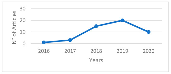 Figure 2 shows the distribution of articles ordered by year of publication. It can be seen that although no restriction was added, the timeframe is only five years (2016–2020). While one article was published in 2016, the number increases in 2017 with a further boost in 2018, which quintuple the retreived amount.