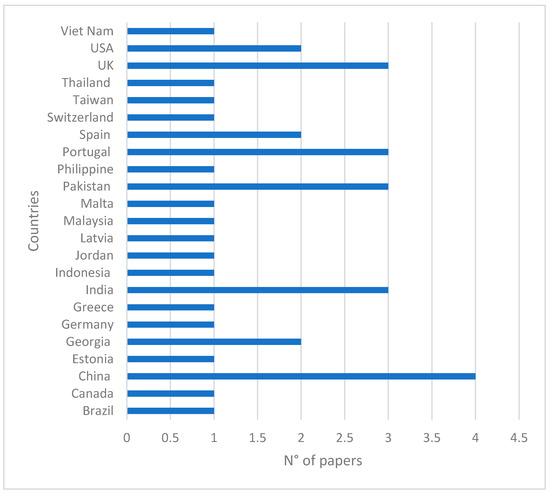 Regarding geographical distribution, Figure 3 shows that publications hailed from Asia (35% n = 17), Europe (33% n = 16), North America (6% n = 3), and South America (2% n = 1). Concerning specific countries, the majority of contributions came from China (4) followed by India, Pakistan, Portugal, and the UK (3). Finally, the USA, Spain, and Portugal produced two while the others produced just one.