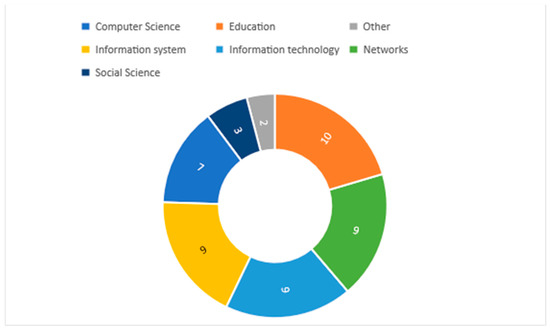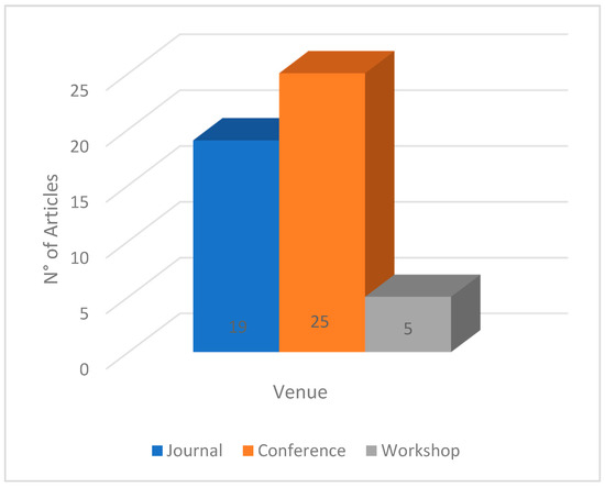 Figure 4 shows the distribution by publication venues. The majority (25) were published in conference proceedings, while 19 were journal publications, and 5 were presented in workshops. Ten articles (20%) were published in Institute of Electrical and Electronic Engineers (IEEE) venues, which was the most common, and as for the topics of publication venues: Figure 5 outlines their distribution. The majority (69% n = 34) are technical venues, while the remaining comes from social sciences (31% n = 15).