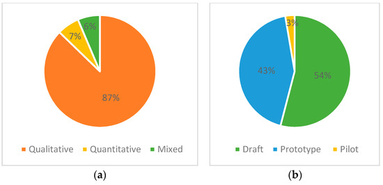 The papers included in this literature review are mostly empirical, but the level of development of the proposed prototypes are different. The majority of papers outline a draft prototype (54% n = 20) with some simulated data, while a considerable amount (43% n = 16), show data from real-world applications. The preferred methodology is qualitative (86% n = 41), while just three used a quantitative methodology and the other three used a mixed method. Figure 6a,b display the methodology types and prototype stages.