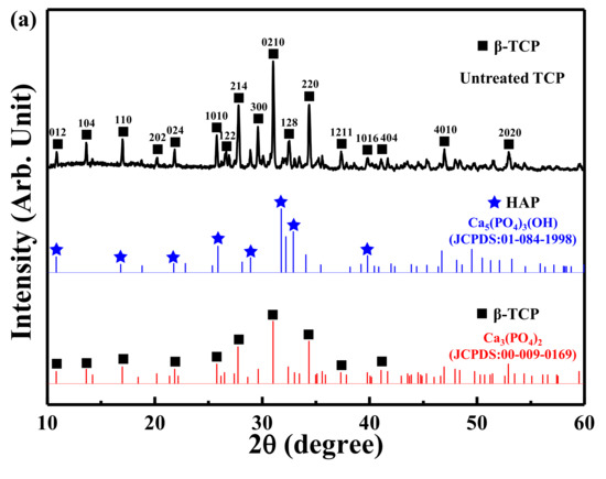 Figure 1a shows the XRD patterns of the untreated TCP. We observed that the raw material resembled the structure of CaP closely, indicating that TCP accounted for most of the TCP/HAP biphasic coral powder. According to the (0210) plane in the XRD pattern, the TCP sample can be identified as β-TCP. In addition, based on JCPDS card 00-009-0169, the result was a typical tricalcium phosphate structure, and its quality was indexed. Furthermore, no additional diffraction peaks were found, indicating that the untreated TCP had a single tricalcium phosphate structure. Figure 1b shows the XRD patterns of the untreated ACP. The results show a broadband of ACP presence in the XRD pattern. Moreover, a weak peak of Ca10(PO4)6(OH)2 was also found, with the characteristic peak of the (211) plane as a reference.