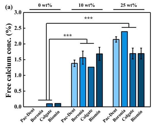 Figure 5a depicts the free calcium concentration of different brands of toothpaste containing TCP powder. It was found that the mean calcium concentrations for 1 g of each toothpaste without TCP powder was 0, 0, 0.10, and 0.11, respectively. The mean calcium concentration obtained from 1 g of each toothpaste containing the 10 wt% TCP powder was 1.38 ± 0.10, 1.56 ± 0.21, 1.26 ± 0, and 1.69 ± 0.21, respectively. In addition, the mean calcium concentration of 1 g of toothpaste containing the 25 wt% TCP powder was 2.14 ± 0.07, 2.39, 1.69 ± 0.17, and 1.69 ± 0.17, respectively. The toothpaste containing TCP powder had a significantly higher calcium concentration than normal toothpaste.