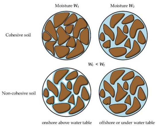 For cohesive clayey soils, as their fluid saturation coefficient is close to unity, the total water content and the degree of cohesion caused by it are more significant. The amount of water contained in cohesive soils depends primarily on the volume of the pore space. Thus, it is supposed that elementary volume of cohesive soils: first, has variable porosity; second, is a two-phase (fluid–solid) medium both at onshore and offshore sites (Figure 2).
