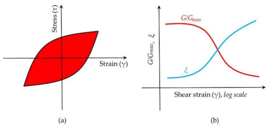 Hysteresis curve (a), shear modulus degradation curves G/Gmax (γ), and damping ratio curves ξ(γ) (b) models for cyclic loading.