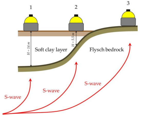 Ocean-bottom seismometers (OBS) deployments at the Black Sea shelf sites: 1—on the surface of the soft clay layer of 14 m; 2—on the surface of the soft clay layer of 5.5 m; 3—on the hard flysch outcrop.