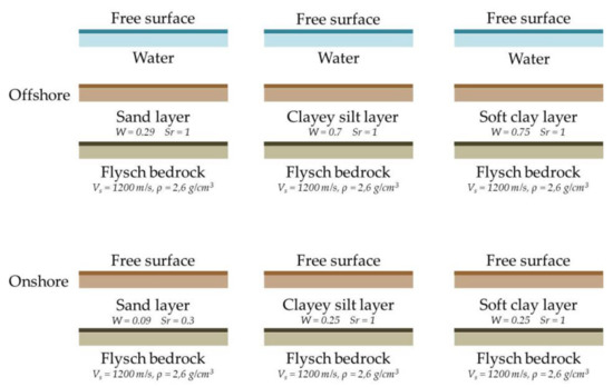 This section is dedicated to numerical simulation and comparison of the responses of porous water-saturated layers of cohesive and non-cohesive soils with parameters specific for low moisture onshore and high moisture offshore sites. For this purpose, synthetic soil layers were constructed (Figure 6) using some values of thickness and geotechnical parameters derived from different marine engineering studies. The parameters of the offshore soils presented in Table 2, Table 3, Table 4 were derived from the results of seismic surveys and core sampling, while the values for their onshore analogs were calculated using Equations (6), (10), (11), (13)–(15) with assumed moisture W and saturation factor Sr. Here it is assumed that clay and clayey silt are cohesive soil and sand is non-cohesive soil. Flysch half-space (Vs = 1200 m/s, ρ = 2.6 g/cm3) is used as underlain bedrock for all synthetic profiles.