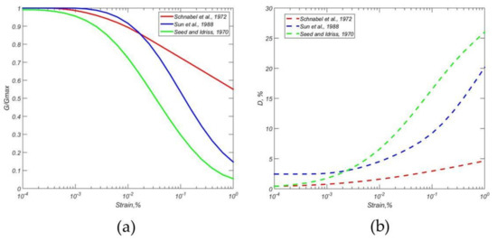 Figure 7 shows the shear moduli degradation curves and damping ratio curves used in this study. The curves used in this study were presented by Schnabel et al. (1973) [45] for flysch half-space, by Sun et al. (1988) [42] for cohesive soils and by Seed and Idriss (1970) [46] for non-cohesive soil.
