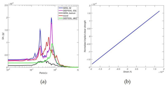 In Figure 8a, the response spectra of the horizontal component of the S-wave are presented both from modeled and experimental records (OBS site with soft clay layer of 5.5 m thickness). The synthetic and observed spectra are largely consistent with each other. The curves for NERA and EQL cases are very similar and slightly overestimated, while the response obtained by the MKZ model is underestimated. Nevertheless, the position of resonant frequency obtained by the MKZ model is more precise. The similarity of the curves for NERA and EQL cases can be due to small strains and near-linear stress–strain dependency while loading (Figure 8b). At the same time, two different constitutive models for nonlinear cases (IM-model for NERA and MKZ-model for DEEPSOIL) gave a more pronounced difference.