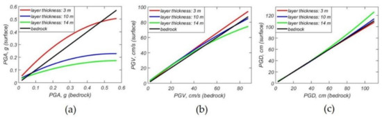 In Figure 10, the approximating curves are shown for the simulated peak ground accelerations (PGA), peak ground velocities (PGV) and peak ground displacements (PGD) on the surface of a soft clay layer with different thickness (3 m, 10 m and 14 m), while different input accelerograms on the bedrock are applied. The amplitude saturation effect is clearly seen. First, the larger thickness of the soft clay layer, the faster saturation occurs. In turn, for calculating macroseismic intensity increase, the mean impedance is used calculated for the soil thickness of 10 or 30 m [24]. Thus, the larger thickness of the soft clay layer, the lower the mean impedance of the upper 10 or 30 m of the soil profile. Second, the saturation effect is less distinguished for velocities than for accelerations, while the displacements, in this case, are in accordance with macroseismic intensity and level of damages.