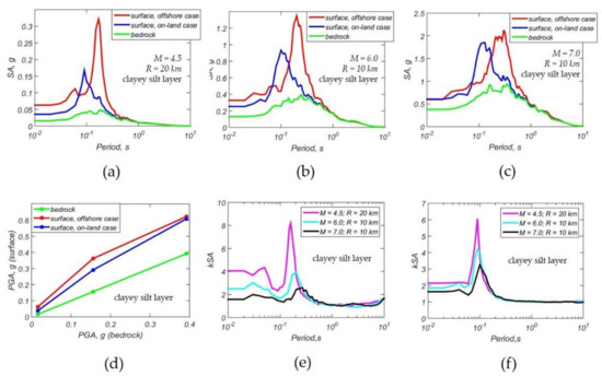 Modeling results for the case of clayey silt layer: (a–c) response spectral acceleration SA (T, 5%); (d) PGA values; (e) acceleration amplification curves for offshore case; (f) acceleration amplification curves for the onshore case.