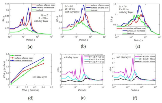 Modeling results for the case of soft clay layer: (a–c) response spectral acceleration SA (T, 5%); (d) PGA values; (e) acceleration amplification curves for offshore case; (f) acceleration amplification curves for the onshore case.
