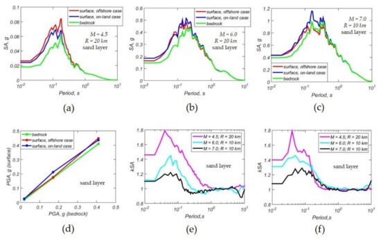 Modeling results for the case of sand layer: (a–c) response spectral acceleration SA (T, 5%); (d) PGA values; (e) acceleration amplification curves for offshore case; (f) acceleration amplification curves for the onshore case.