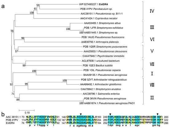 Phylogenetic tree of EstDR4 and homologous sequence alignment. (a) Phylogenetic evolutionary tree of EstDR4 constructed using 21 amino acid sequences of lipolytic enzymes from different families and EstDR4. The protein ID at NCBI or the protein databank (PDB) are shown before the name of the strain that was the enzyme source. (b) Homologous sequence alignment constructed using the amino acid sequences of EstDR4, Pseudomonas sp. lipase (AAC38151.1), and Parvibaculum sp. esterase (PDB ID 4YPV), which all belong to family IV. The catalytic triads are marked by black arrows.