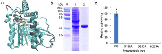 Tree dimensional structure, purification and enzyme activity of the mutants of EstDR4. (a) The predicted three-dimensional structural model of EstDR4. The tertiary structure of EstDR4 (blue ribbon) was modeled on that of Est8 (PDB 4YPV, gray ribbon). Potential catalytic triad residues (Ser156, Asp253 and His283) are marked on the figure. (b) SDS-PAGE electrophoresis of EstDR4. Lane M: marker, lane 1: crude, lane 2: purified EstDR4. The EstDR4 protein band at ~35 kDa, was in accordance with the prediction that EstDR4 (33 kDa) added with the HisTag. (c) WT is the wild type EstDR4, the mutants are S156A, D253A and H283A. The different letters between each condition indicate significant differences (p < 0.05).