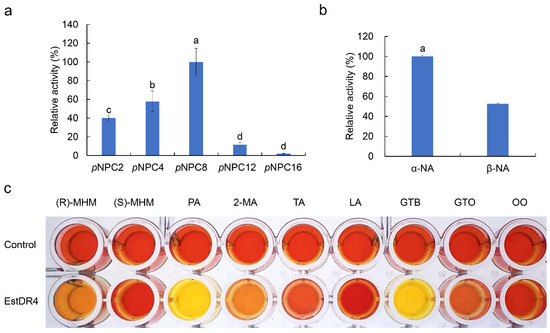 Substrate specificity of EstDR4. (a) Substrate specificity of EstDR4 toward pNPC2, pNPC4, pNPC8, pNPC12, and pNPC16. The maximum activity measured towards pNPC8 was taken as 100%. (b) Substrate specificity of EstDR4 toward α-NA and β-NA. The different letters between each condition in (a,b) indicate significant differences (p < 0.05). (c) Substrate specificity of EstDR4 toward (R)-MHM, (S)-MHM, PA, 2-MA, TA, LA, GTB, GTO, OO.