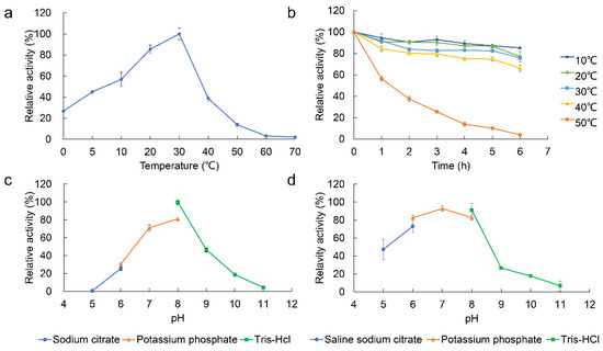The optimum temperature of EstDR4 was tested from 0–70 °C using pNPC8 as the substrate. EstDR4 displayed maximum catalytic activity at 30 °C and retained 26.77% and 44.98% relative activity at 0 °C and 5 °C, respectively. The activity increased consistently from 0–30 °C and decreased rapidly at higher temperatures; the enzyme was almost inactivated at 70 °C (Figure 4a). EstDR4 exhibited high stability from 10–40 °C, with over 80% residual activity detected after 1 h of incubation, and the enzyme retained 66.32% residual activity after 6 h incubation at 40 °C. However, EstDR4 residual activity was sharply reduced to approximately 56.31% after incubation at 50 °C for 1 h (Figure 4b).
