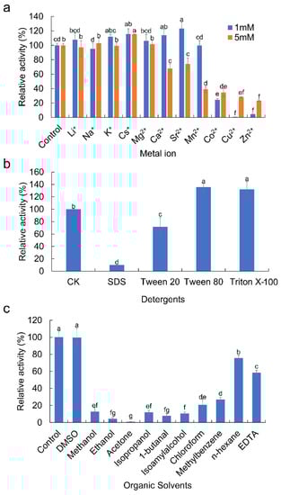 Effect of metal ions, detergents and organic solvents on esterase activity of EstDR4. (a) Effect of metal ions (1 and 5 mM) on EstDR4 activity: Li+, Na+, K+, Cs+, Mg2+, Ca2+, Sr2+, Mn2+, Co2+, Cu2+ and Zn2+. (b) Effect of detergents on enzyme activity: SDS, Tween 20, Tween 80 and Triton X-100. (c) Effect of organic solvents (25% v/v) on EstDR4 activity: dimethyl sulfoxide (DMSO), methanol, ethanol, acetone, isopropanol, 1-butanol, isoamyl alcohol, chloroform, methylbenzene and n-hexane. The relative activity of the control without metal ions, detergents and organic solvents was regarded as 100%. The different letters between each condition indicate significant differences (p < 0.05).