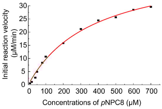 The kinetic parameters of EstDR4 were determined using different concentrations (10~700 µM) of pNPC8 as substrate. The apparent Km and Vmax values were calculated to be 372.50 µM and 45.91 µM·min−1, respectively. Therefore, the kcat and kcat/ Km values for EstDR4 were 28.34 s−1 and 76.08 s−1mM−1, respectively (Figure 6).
