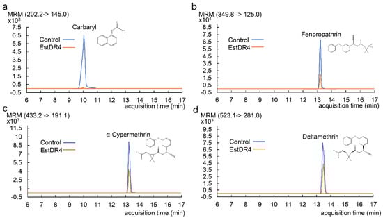 Degradation of insecticides by EstDR4. (a) carbaryl; (b) fenpropathrin; (c) α-cypermethrin; (d) deltamethrin. The initial concentration of carbaryl was 5 μg·mL−1, the concentration of EStDR4 in the experimental group was 42 μg·mL−1, while the control group was replaced with the same concentration of boiled inactivated EstDR4.