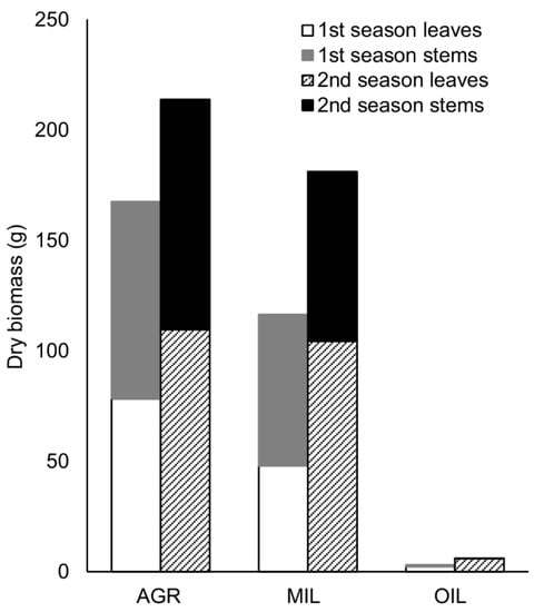 Dry biomass yield was the highest in AGR soil (214 g from 4 rhizomes in the second year). However, for MIL, the biomass amount (181 g) was still quite satisfying and applicable for further processing. On the other hand, in OIL soil, only up to 6 g of dry biomass was produced from four rhizomes (Figure 1). The ratio of stems was higher in AGR (53%) and MIL (59%) than leaves in the first year of growth, but the second year and OIL soil, the leaves made up most of the biomass weight.