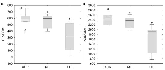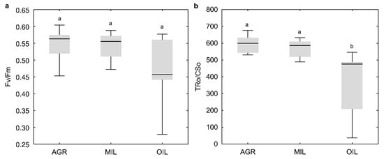 Based on fluorescence measurements, common parameters were calculated to characterize plant fitness via the use of light (Figure 3). The most common parameter Fv/Fm (Figure 3a) showed a lower median value of OIL. However, this difference was not statistically significant. Another three selected indexes: TR0/CS0 (Figure 3b), ET0/CSm (Figure 3c) and ABS/CSm (Figure 3d), which are not so often used in literature, confirmed lower values of OIL. For these indexes, the difference was even statistically significant. Additionally, OIL results exhibited much higher variability. AGR and MIL parameters were comparable.