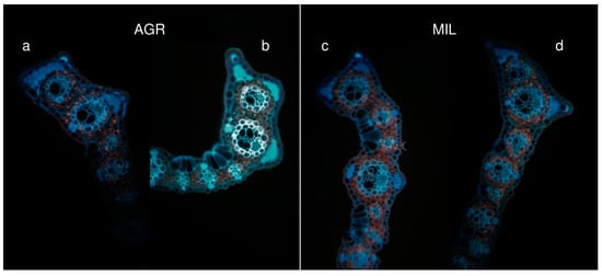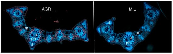 In the 5 cm section (Figure 7), all differences between these two variants became obvious. AGR plants possessed thick sclerenchyma layers along with big vascular bundles. Those were mostly located at the edge of the leaf blade. Moreover, the entire leaf of AGR plants was also covered by a thick cuticle.