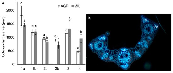 Size of 4 sclerenchyma areas in 1 cm leaf section (a) (mean ± SD, n = 3) and sclerenchyma area position (b), the same letters above bars mark comparable groups according to T-test (p < 0.05) – only results for AGR and MIL for the same sclerenchyma area are compared mutually.