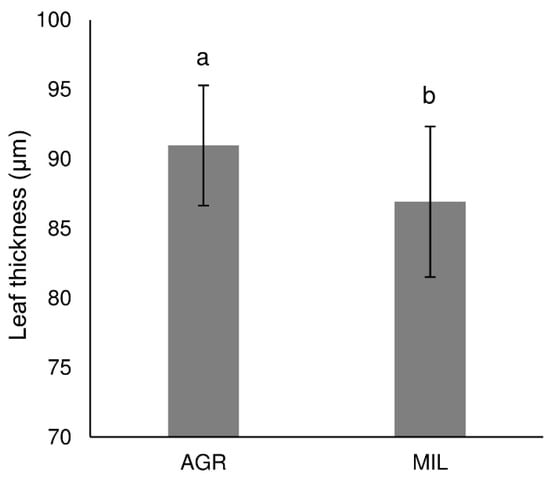 Leaf thickness in section taken 1 cm from leaf tip (mean ± SD, n = 24), the same letters above bars mark comparable groups according to T-test (p < 0.05)