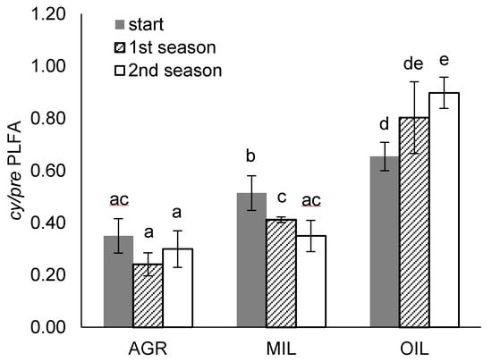Stress indicator cy/pre PLFA (Figure 8) was increased in comparison to expected values (i.e., 0.4 typical for undisturbed soils [52]) in MIL and OIL variants. Initial values for different soils were significantly different, with the lowest value for AGR and the highest value for OIL. Further monitoring during the experiment showed further development in tested soils. In AGR, the values did not change significantly. In MIL soil, the values were continuously decreasing to the level comparable with AGR. On the other hand, in OIL, the values were continuously increasing during two seasons, indicating a more intense stress response. Revealing the cause of the indicator changes will require significant further research. Nevertheless, we can hypothesize for the positive effect of miscanthus in MIL soil (note that the biomass in OIL was significantly reduced).