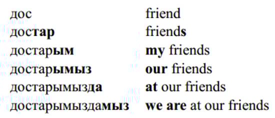 Example of Kazakh suffixation. The left side is Kazakh words with various suffixes. The right side is English translation with various phrase lengths [18].