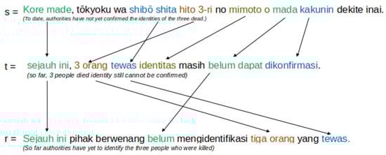 Table 13 and Table 14 also show that the word order of the generated text was incorrect. We found that the generated text appeared to follow the source language’s sentence pattern, i.e., subject-object-verb (SOV), whereas the sentence pattern of the target language is subject-verb-object (SVO). We used the default reordering model, i.e., msd-bidirectional-fe; however, our generated text results still followed the source language’s pattern. The msd-bidirectional-fe is a default reordering model in SMT that considers the orientation of the model, directionality, and languages. The incorrect word order may also be the reason for the insignificant improvement in the BLEU score in our system, as shown in Table 7. BLEU is an evaluation metric that measures the similarity between two text strings and assigns too much weight to correct word order [40]. BLEU was used a reference file to evaluate the generated text. Our generated text results follow the source languages’ sentence pattern, i.e., SOV, whereas our reference files used the SOV pattern. Therefore, the evaluation process could not obtain the maximum results due to the differing word order between the generated text and the reference file. Figure 3 illustrates an example of the generated text from the system of Ja–Id LM03 H-ISA. The system translates a source sentence into the target sentence . The result showed that the generated Indonesian text had the same word position as the Japanese text. Additionally, Figure 3 illustrates a comparison between t and r with a different phrase. Given an example of t, which used the phrase "3 orang tewas/3 people died", r used the phrase "tiga orang yang tewas/three people who were killed". Furthermore, t and r had different word positions, leading to the difficulty in maximizing BLEU script usage.