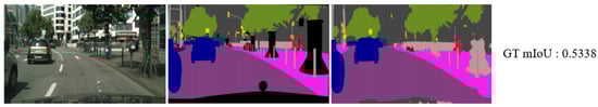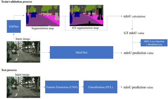 When applying semantic segmentation networks to real-world applications for safety issues, it is a problem that there are no clear criteria to judge failure cases. In other words, allowing the system to detect failures is important for self-driving [25,26,27] in autonomous driving systems. For example, predicted semantic segmentation map from neural network, Figure 1 (right), displays the misrecognition of the sidewalk as a lane. If such misconception occurs in the network of actual autonomous driving vehicles, it can function as a fatal flaw which leads to serious accidents (e.g., fatality or car accident). Therefore, the function of notifying them and handing over authority to drivers is essential when the driving system has delivered the wrong results to drivers. To prevent such accidents, we propose a neural network method by predicting the mean intersection of union (mIoU), which is a widely used evaluation metric in the semantic segmentation task, indicating how accurately each pixel of the image is classified.