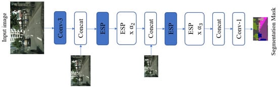 - Mehta, S.; Rastegari, M.; Caspi, A.; Shapiro, L.; Hajishirzi, H. Espnet: Efficient spatial pyramid of dilated convolutions for semantic segmentation. arXiv 2018, arXiv:1803.06815. [Google Scholar]