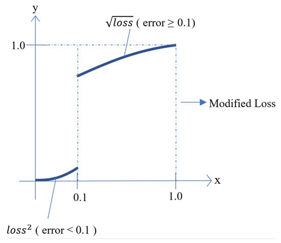 The new modified loss corrects the overfitting problem by minimizing the effect on outliers for robustness in normal networks. When the difference between the actual and scalar value is less than 0.1, the transformed loss value is squared by the initial loss value, and, when it is greater than 0.1, the original loss value is square-rooted. As shown in Figure 6, in the case of a loss calculated less than the value of 0.1 as the error margin, a smaller loss value is used. In the opposite case, a larger loss value is used to allow the optimizer to backward error: