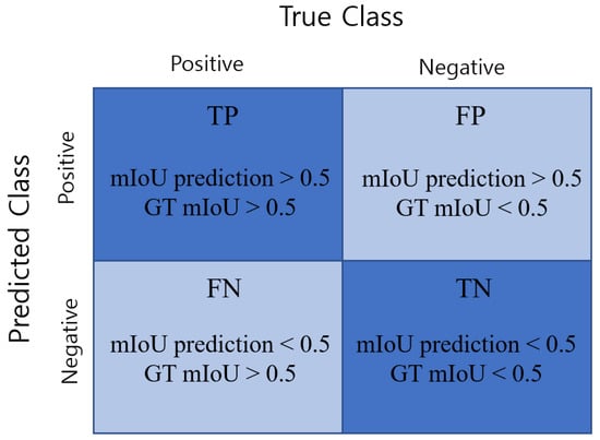 The results of the experiment are classified into each situation according to the following criteria: True positive (TP) and true negative (TN) are the cases when the performance of ESPNet is well predicted by mIoUNet. In more detail, TP is defined when the mIoU prediction value and the GT mIoU value are greater than a threshold value of 0.5 where TN is smaller than 0.5. In both cases, the mIoUNet successfully detects not only the failure case but also success case for ESPNet. On the other hand, false positive (FP) and false negative (FN) are when mIoUNet fails to predict the failure or success case of ESPNet. FP is defined as the mIoU prediction value is larger than 0.5, but the GT mIoU prediction value is less than 0.5. On the contrary, FN is defined as the mIoU prediction value is smaller than 0.5, but the GT mIoU prediction value is greater than 0.5. In both cases, we define that the mIoUNet fails to detect properly the failure cases and success cases.