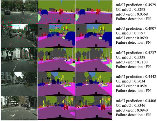 Finally, as a result of analyzing pictures with terrible error values, we observed that the proposed model successfully detects failure cases. We note the possibility that the performance of the proposed network can be improved according to the performance of semantic segmentation that creates the GT mIoU. This result suggests that a more accurate and robust semantic segmentation model results in better performance of the proposed model.