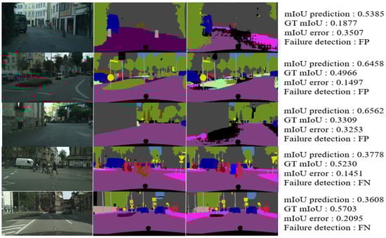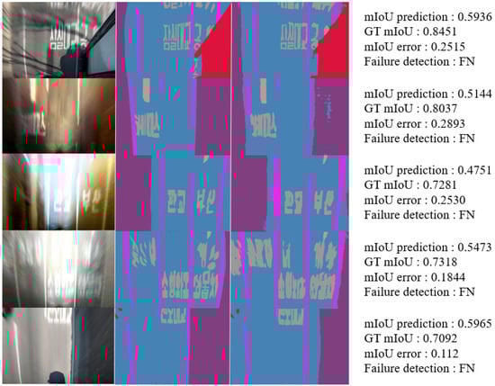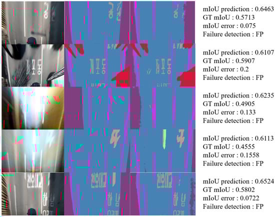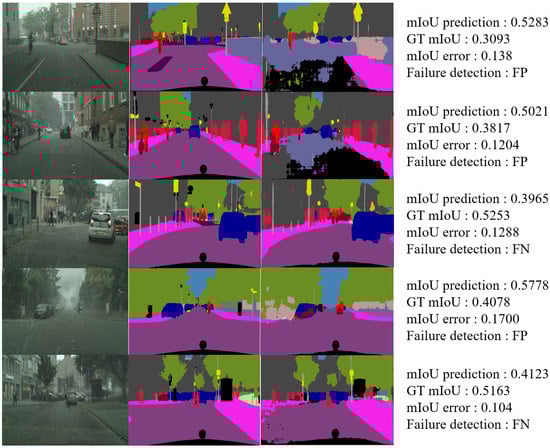 Experiments were conducted with images from the rain/haze composite version of the Cityscapes dataset (Figure 13). This can be viewed in the same domain but in a different environment. The quantitative test result is the average of all the result values for the testing set. The qualitative test results show the input image, GT segmentation map, and segmentation map for the testing set at the same time, as well as the GT mIoU, mIoU prediction, mIoU error value, and failure detection result of the image.