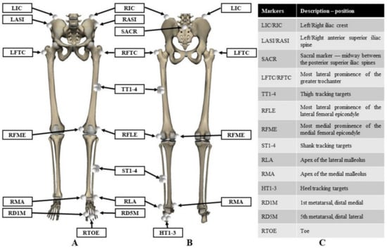 Illustration of reflective markers attached to the lower limbs. (A) Front view; (B) rear view; (C) marker description.