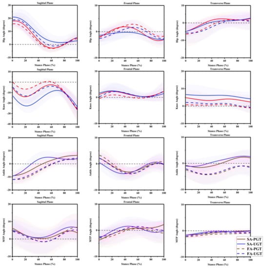 Lower extremity joint kinematic patterns of the hip, knee, ankle, and MTP joints were plotted against the percentage of stance for the PGT and UGT from subjects with SA/FA conditions (Figure 2). The lower extremity joint ROMs during two types of gait terminations are shown in Table 1.