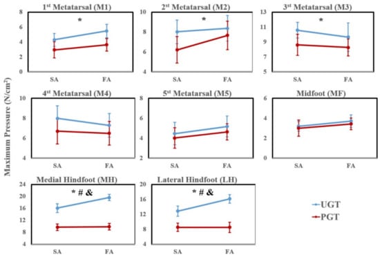 The significant differences in dynamic plantar pressure distribution caused by the gait termination patterns are mainly concentrated in the forefoot and rearfoot areas. The M2 and M3 have less freedom of motion owing to being wedged to the cuneiform joints. This zone is not sufficient to dissipate the loads they receive, and this results in bearing relatively greater pressure []. Compared with PGT, there are not enough buffering processes in the face of unexpected stimuli during UGT. The subjects need to generate a net braking impulse in a short time []. During the terminal swing phase, the rearfoot (i.e., calcaneus) contacts initially with the ground and loads most of the body mass []. Excessive maximum pressure might be a potential risk factor for foot injuries such as stress fractures []. Structurally, the most significant diversity between FA and SA is the plantar contact area of the midfoot due to the difference in stiffness during the stance phase. At the same time, more rigid feet are less able to absorb impact during locomotion []. The decrease in the contact area is linked with larger loads in the forefoot as well as rearfoot [], and our current results have also confirmed the above-mentioned observation, which might cause the increased risks of lower-limb overload injuries [,].