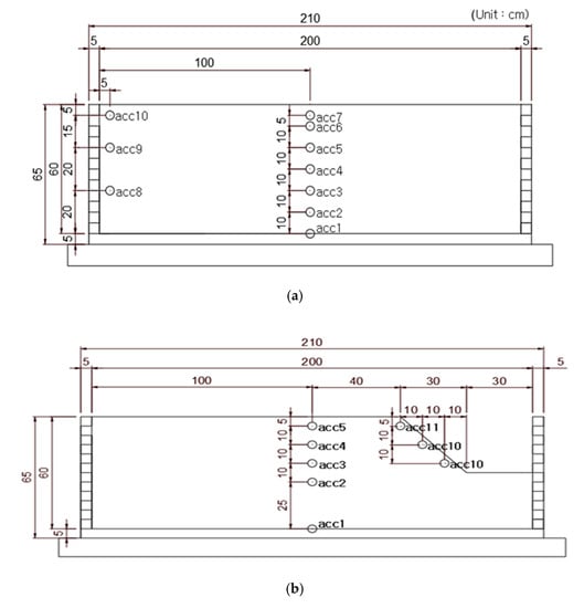 The response acceleration measured in this test was expected not to be faster than 20 m/s2 in terms of range, and the assumption was based on the frequency component of response data not being greater than 40 Hz, and the room temperature. The reason why the 20 m/s2 accelerometer was used is that the test level in the 1 g shaking table test was less than 20 m/s2. Therefore, the selected accelerometer was ARF-20 A, which can measure up to 20 m/s2. The data logger had 12 channels and was compatible with ARF-20 A as a four gauge sensor, and the data collection interval was maximum 0.001. Figure 3 shows the locations of the accelerometers installed in flat ground and slope model.