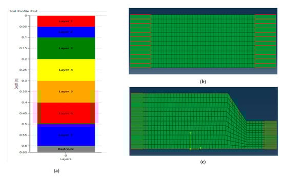 DEEPSOIL software is a 1-D infinite half-space program. Because of the limitations of the DEEPSOIL software, modeling is done only in the flat ground model, modeling and boundary settings are shown in Figure 4a. ABAQUS software is a multi-dimensional modeling program. Artificial boundary conditions have a direct impact on the accuracy of numerical simulation of near-field fluctuations, so the study of artificial boundary conditions is of great significance. In order to eliminate the effect of boundary on model analysis results, the two sides of boundary are redesigned infinite boundaries, as shown in Figure 4b,c.