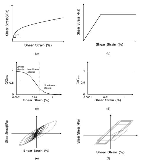 Figure 5a,b show the shear stress-shear strain curves of Darendeli model and Mohr-Coulomb model. Figure 5c,d are the G/Gmax-shear strain curve of Darendeli model and Mohr-Coulomb model. In the Darendeli model, G/Gmax decreases with an increase of shear strain, from linear elasticity to non-linear elasticity to unlimited plasticity. The G/Gmax- shear strain of the Mohr-Coulomb model does not change with an increase of strain. Figure 5e,f show the Darendeli model and the Mohr-Coulomb model using hysteresis curves to calculate the damping ratio. In the Darendeli model, the nonlinearity of shear stress and shear strain will increase energy consumption. Therefore, the damping ratio will increase as shear strain increases. The Mohr-Coulomb model stress-strain curve is linear, so the damping ratio is basically unchanged.