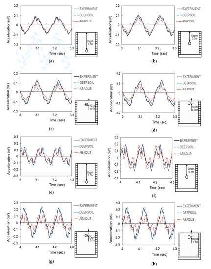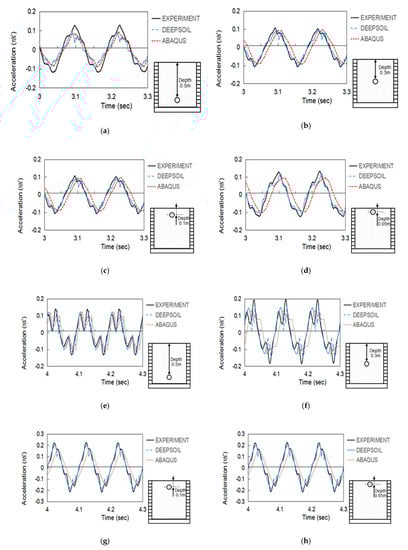 As shown in Figure 6, both the 1 g shaking table tests and numerical analyses show the similar acceleration-time history near the bottom. In particular, the 1D ground response analysis results obtained by DEEPSOIL have a good match with the 1 g shaking table test results. This implies that the 1 g shaking table tests with the laminar shear box can simulate the free field behavior of soil subjected to earthquake loading. As shown in Figure 6a–h, it was observed that the time history of the experiment and numerical analysis was slightly different as it goes to the top of the model. This is expected because the more short-period frequency components are added to the overall curve and the amplification difference increases. The short-period frequency components included in the input motion had a minimal effect on the lower part, but the effect on the amplification accumulated toward the upper part of the model is judged to affect the time history graph curve. However, since these short-period frequency (i.e., short period frequency level that is much larger than the natural frequency of the model) components do not coincide with the main amplification period of the model, in other words, no resonance occurs. This effect is unlikely to have a significant effect on spectral acceleration analysis.